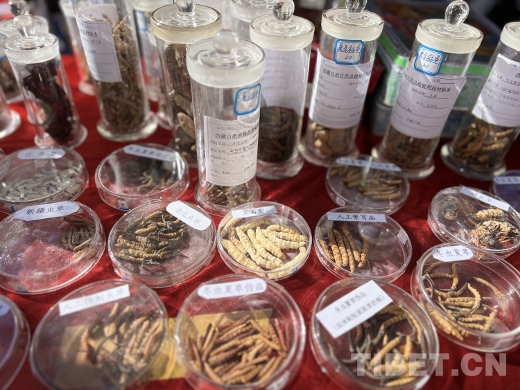 圖為市場監(jiān)管局工作人員向尼尼講解真假蟲草辨別方法 攝影:德吉卓瑪