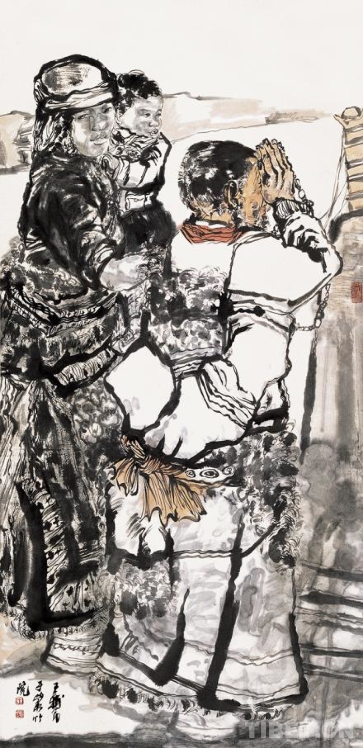 “真正深入當(dāng)?shù)厝ンw驗(yàn)藏族群眾的生活,創(chuàng)作出來的作品才會(huì)真實(shí)感人?!蓖踺o民在談到藏族題材的創(chuàng)作感悟時(shí)說,“青藏高原最吸引人的地方是生活在這里的人們飽滿的精神狀態(tài)。我們要敬畏自然,尊重文化,保持充滿感情、充滿崇敬之情的創(chuàng)作情感和態(tài)度,用中國畫的水墨形式去表現(xiàn)藏族群眾的生活,去表現(xiàn)雪域的蒼茫與藏族群眾頑強(qiáng)不屈的性格,表現(xiàn)人與自然的關(guān)系。”