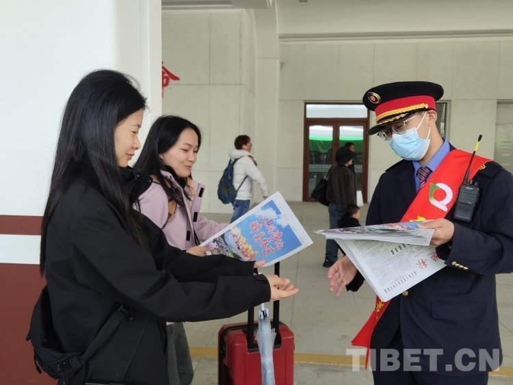 圖為為助力林芝第二十一屆桃花旅游文化節(jié),方便廣大游客了解林芝、觀賞林芝獨(dú)具特色的旅游景點(diǎn),林芝火車站為到站旅客介紹林芝各縣(區(qū)、市)獨(dú)具特色的景點(diǎn)、美食及賞花旅游攻略,同時(shí)為游客分發(fā)集合相關(guān)交通信息和氣象信息的《林芝報(bào)》。