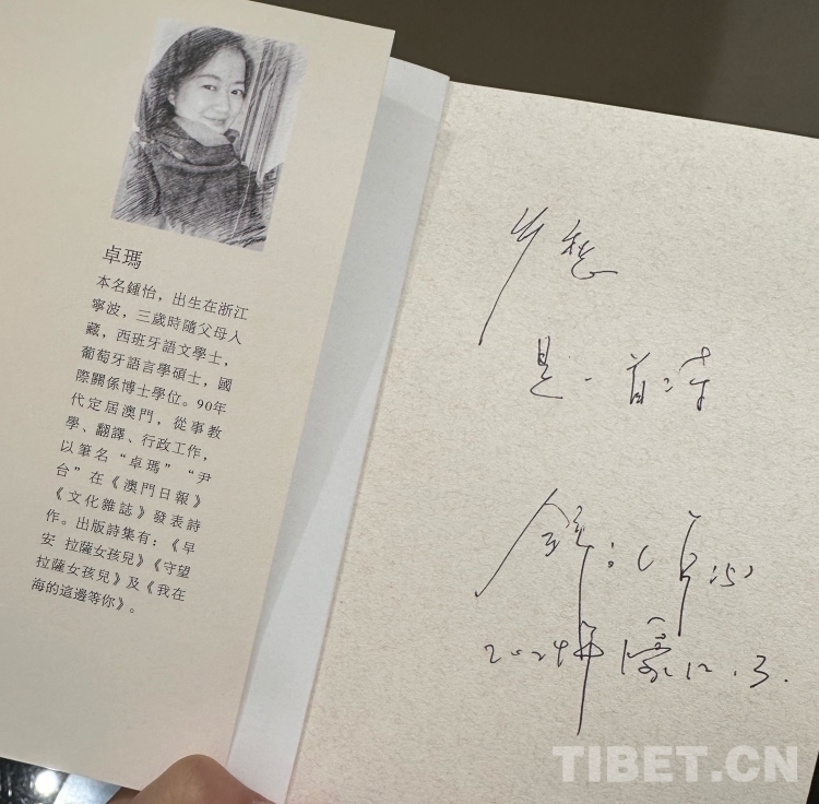 用餐結(jié)束后,卓瑪姐送我們每人一本她最新創(chuàng)作的詩(shī)集《昨天和明天都會(huì)回來(lái)》,并在扉頁(yè)親手寫(xiě)上寄語(yǔ),每人的寄語(yǔ)都不同。她在贈(zèng)予帕洛扎的書(shū)上寫(xiě)著“鄉(xiāng)愁,是一首詩(shī)”,給我寫(xiě)著“走著走著別把自己走丟了”,給浩然寫(xiě)著“別輕視 弱小的溫柔”……每條寄語(yǔ),都寄托著卓瑪姐他鄉(xiāng)遇故知的溫暖與感動(dòng)。對(duì)于西藏,我想卓瑪姐與帕洛扎一樣,都已經(jīng)把它當(dāng)成了自己深愛(ài)的故鄉(xiāng)。西藏承載著她兒時(shí)的記憶,小時(shí)候居住過(guò)的水泥廠、上學(xué)時(shí)走過(guò)的路、拉中的老師同學(xué)……那些或欣喜或難忘的往事,都是她與西藏這片土地最真實(shí)的情感連接,這種情懷,無(wú)法割舍,更不能割舍。(中國(guó)西藏網(wǎng) 記者/呂靜 易文文 姚浩然 王東)