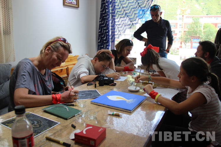 圖為正在爐霍體驗(yàn)郎卡杰唐卡的外國友人