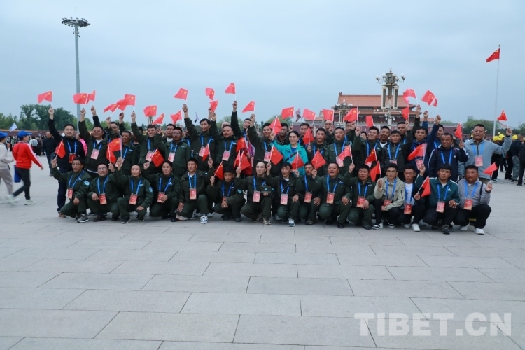 圖為“西藏自治區(qū)野生動物保護(hù)員進(jìn)京考察學(xué)習(xí)團(tuán)”成員觀看升旗儀式的集體留念 攝影:莫干措
