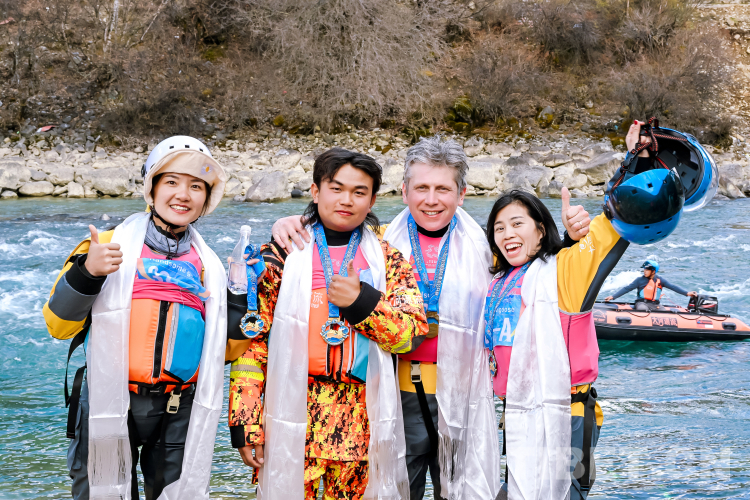 公開(kāi)賽的第二天,高原峽谷天氣雖有短暫突變,比賽也一度延遲,但接下來(lái)云開(kāi)霧散的巴河河道,卻在雪山、杜鵑、桃花和村落的映襯下格外清麗脫俗,29支四人漂流艇拉力賽隊(duì)伍,隨著發(fā)令槍響,依次如利箭般劃出。經(jīng)全程8公里奮勇拼搏,由成都伽斯特健身俱樂(lè)部、重慶彭水縣和朝陽(yáng)戰(zhàn)隊(duì)三支隊(duì)伍獲四人漂流艇拉力賽前三名。