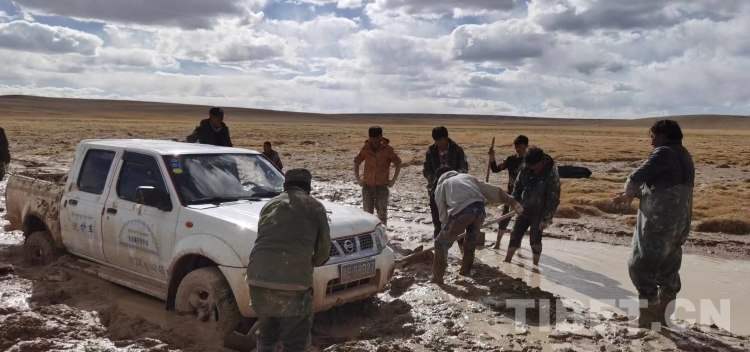 圖為強(qiáng)巴和同事在巡護(hù)路上被困(強(qiáng)巴供圖)