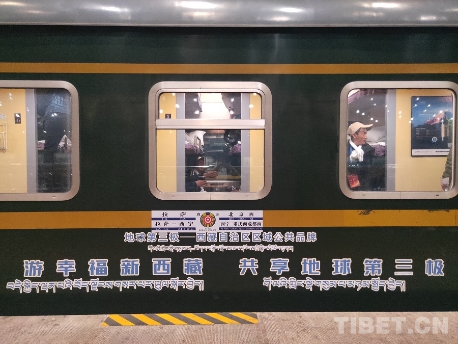 圖為考察學(xué)習(xí)團(tuán)成員乘坐的張貼“地球第三極”標(biāo)識(shí)的鐵路Z21次列車(chē) 攝影:周晴晴