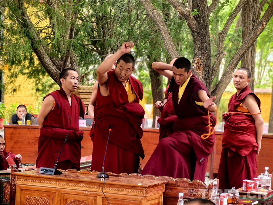 午后的陽(yáng)光慵懶地灑在辯經(jīng)場(chǎng),卻擋不住辯經(jīng)的智者們爭(zhēng)先恐后、高舉手臂提問,手臂向下?lián)]落,象征著智慧之劍砍向無(wú)知。熱烈的氣氛中,智者們拍手擊掌、獨(dú)立頓足、舞動(dòng)佛珠、慷慨陳詞、大聲質(zhì)問,仿佛如此便得到了無(wú)窮的智慧?;顒?dòng)現(xiàn)場(chǎng)氣氛十分熱烈、精彩紛呈,交流內(nèi)容充實(shí)飽滿、將所學(xué)與實(shí)際相結(jié)合,充分展現(xiàn)了日常所學(xué)所思所得,閃光思維的碰撞迸發(fā)了智慧的火花,贏得了現(xiàn)場(chǎng)觀眾拍手叫絕,陣陣掌聲。