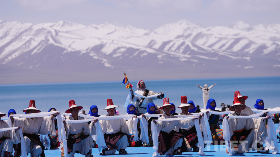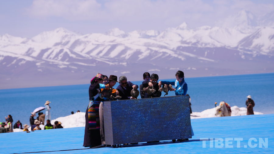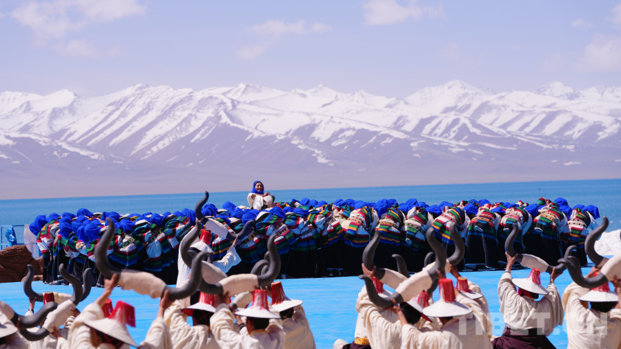 念青唐古拉山脈皚皚雪山高聳入云,清澈碧藍(lán)的納木錯湖水一望無際,牧民牽著白牦牛在湖邊悠閑地散步,成群的棕頭鷗發(fā)出歡快的叫聲在空中自由飛翔……在令人如癡如醉的絕美景色為背景的祈福儀式上,身著盛裝的300名演員結(jié)合當(dāng)?shù)孛袼孜幕峙豕_(dá)、牛角、烏爾朵(拋石器)等呈現(xiàn)盛大的祈福儀式,給現(xiàn)場觀眾帶來一場羌塘高原別具一格的視覺盛宴。