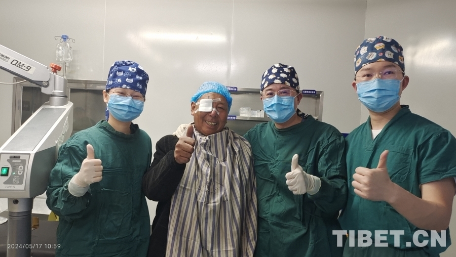 圖為患者拉巴對(duì)為自己實(shí)施眼科手術(shù)的醫(yī)生豎起大拇指