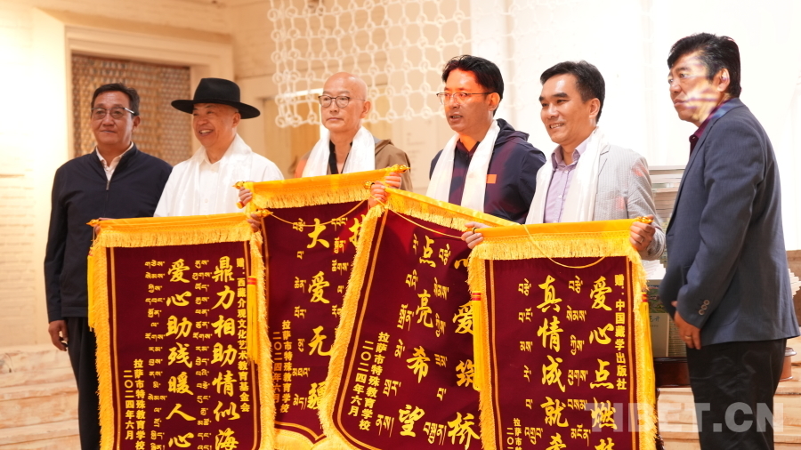 活動最后,中國藏學(xué)出版社向拉薩市特殊教育學(xué)校學(xué)生贈送繪畫用品,拉薩市特殊教育學(xué)校云旦平措校長、尼瑪書記向現(xiàn)場來賓贈送新書。