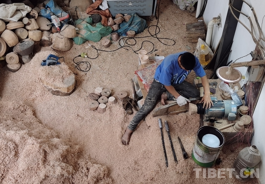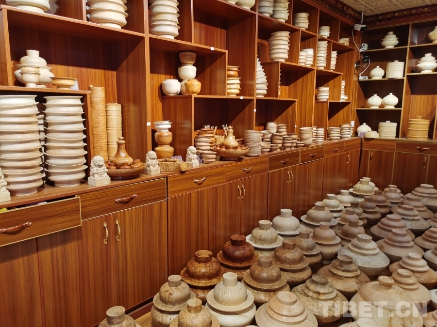 我們首先來到的是四川省非物質(zhì)文化遺產(chǎn)項(xiàng)目——藏族民間車模技藝體驗(yàn)基地。基地一層是工作區(qū),一位師傅正在全身心制作木質(zhì)生活用具,絲毫沒有察覺我們的到來。于是沒有過多打擾,我們徑直來到二樓展品陳列區(qū)。藏族民間車模技藝傳承人格絨次仁的兒子洛絨次仁拿起一個木碗,臉上露出樸實(shí)而靦腆的微笑介紹道,“這些都是選用樹瘤制作而成,一般選用鵝掌木、杜鵑等15類樹木,因?yàn)橹蹦救菀琢验_。為了用具不裂開,處理后的樹瘤煮水后需晾干五至六個月,一個木碗制作工序可能要長達(dá)半年才能完成。此項(xiàng)技藝在家族傳承至今已有四代,我們要做就做好一點(diǎn)?!甭褰q次仁大哥希望更多人能了解這項(xiàng)非物質(zhì)文化遺產(chǎn),有更多人愿意來傳承學(xué)習(xí)這份技藝,有更多人喜歡他們制作的這些木質(zhì)生活用具。