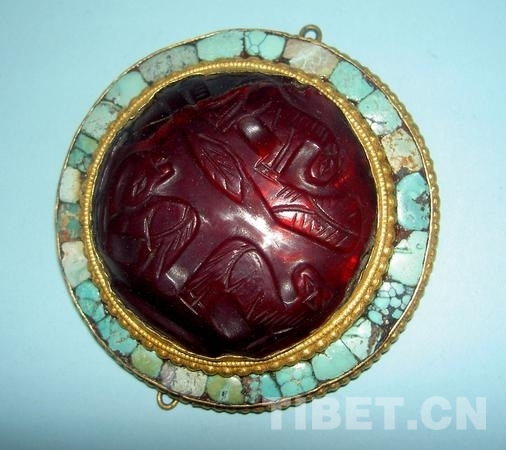 大英博物館藏19世紀(jì)圓形銅鎏金鑲紅玻璃綠松石飾品(16號(hào))