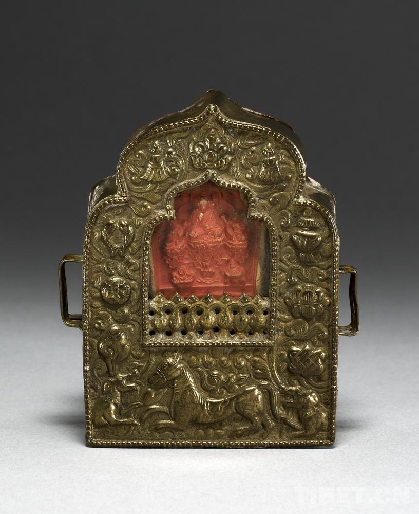 19號(hào)藏品為銅制“嘎烏”,內(nèi)裝有“擦擦”和香料包,出自西藏,進(jìn)入館藏時(shí)間為1905年?!案聻酢保遣卣Z的音譯,指護(hù)身佛的盒子,即小型佛龕。盒子里一般裝有“擦擦”佛像、印著經(jīng)文的綢片、舍利子或者甘露丸、由高僧念過經(jīng)的藥丸,以及活佛的頭發(fā)、衣服的碎片等?!案聻酢边€是精美的裝飾品。其形狀不一,一般為銀質(zhì)或銅質(zhì),盒面上鑲嵌有瑪瑙、綠松石,雕刻有多種花紋圖案。