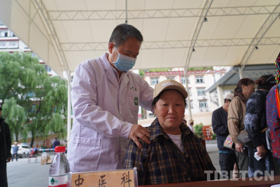 圖為中醫(yī)科專家為當(dāng)?shù)鼐用窳x診 丹巴縣融媒體供圖