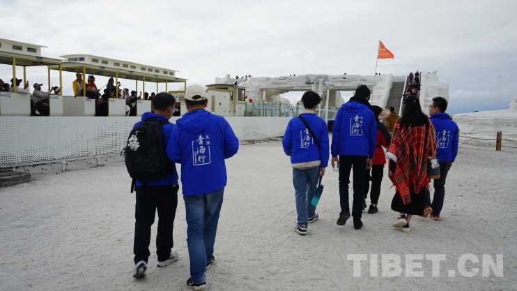 圖為導(dǎo)游小段向香港青少年學(xué)子介紹鹽湖景區(qū)。140余人的大隊伍卻只有少數(shù)人跟上,其他人早已迷失于茶卡鹽湖的美景之中。攝影:李泓慶
