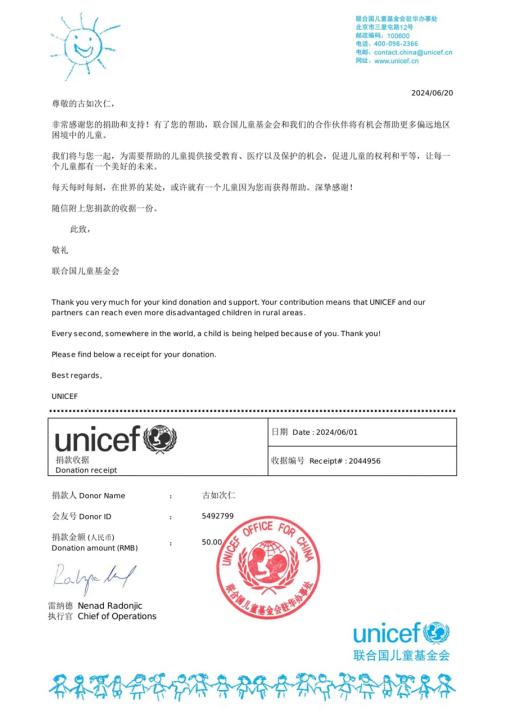 “之后的每個(gè)月我都會(huì)把省吃儉用節(jié)約下來(lái)的錢捐贈(zèng)給聯(lián)合國(guó)兒童基金會(huì),雖然每月捐贈(zèng)的金額數(shù)不大,但我這幾年一直力所能及地堅(jiān)持做著這件事?!惫湃绱稳收f(shuō),到大學(xué)后每月還有勤工儉學(xué)的收入,所以我會(huì)繼續(xù)堅(jiān)持做這件事,能通過(guò)自己的方式幫助到貧困兒童非常有意義。