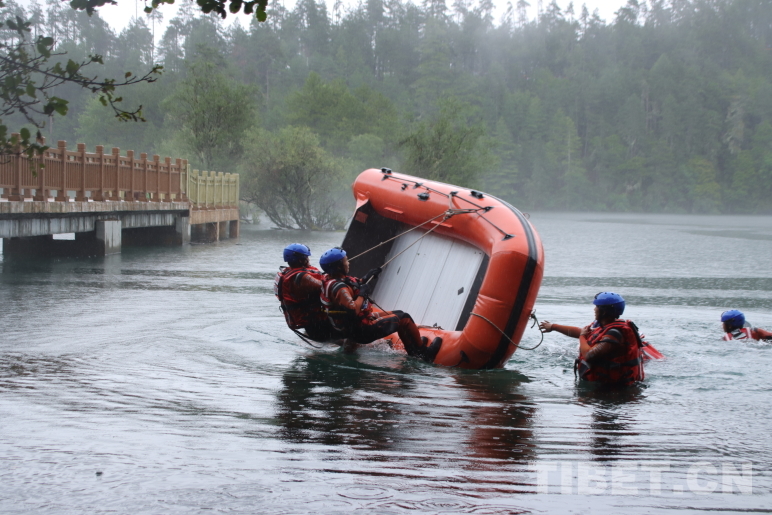 圖為波密縣森林消防中隊指戰(zhàn)員進行翻船自救訓練