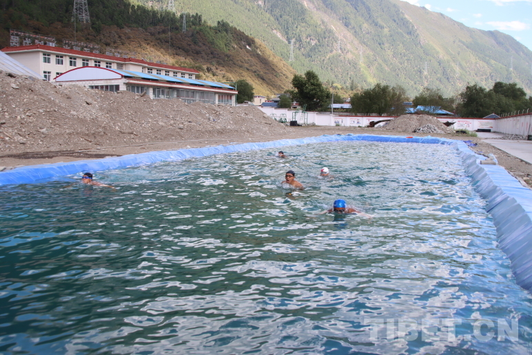 圖為波密縣森林消防中隊指戰(zhàn)員利用自建簡易泳池開展游泳訓練