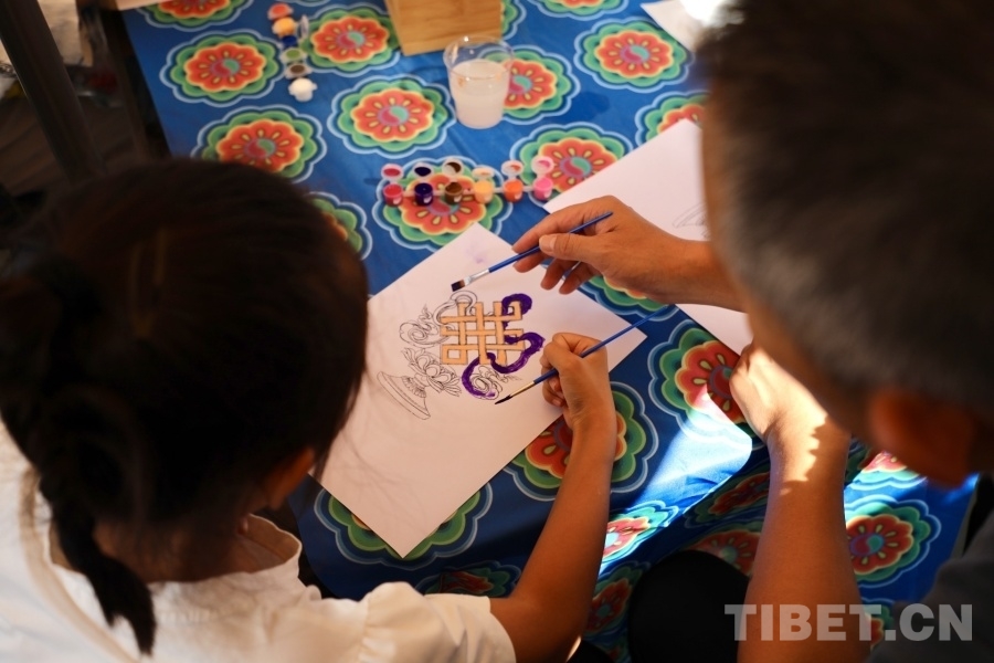 圖為觀眾父女倆在現(xiàn)場(chǎng)體驗(yàn)唐卡繪畫 攝影:龍真多吉