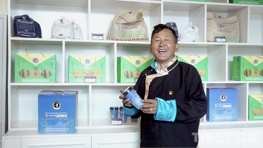 圖為申藏村黨支部書記旺扎正在介紹糌粑產(chǎn)品 攝影:邊子捷