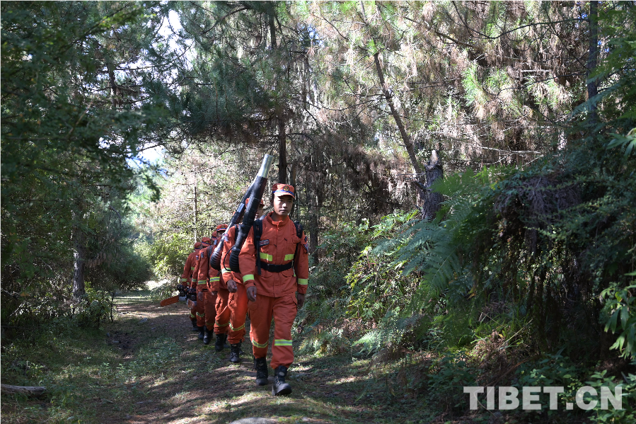 圖為波密縣森林消防員在林區(qū)巡護(hù)