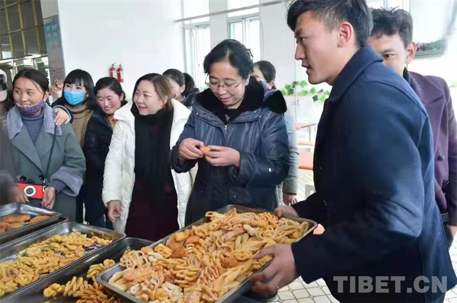 圖為次仁拉姆查看學(xué)校食堂內(nèi)伙食供應(yīng)情況