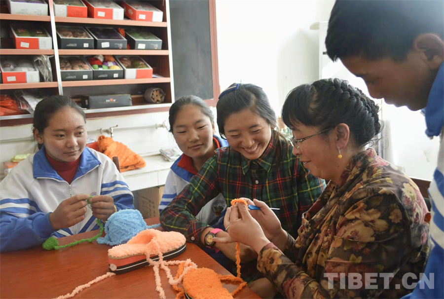 圖為次仁拉姆教孩子們做手工