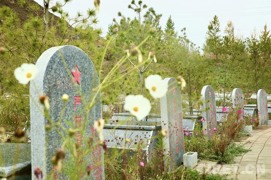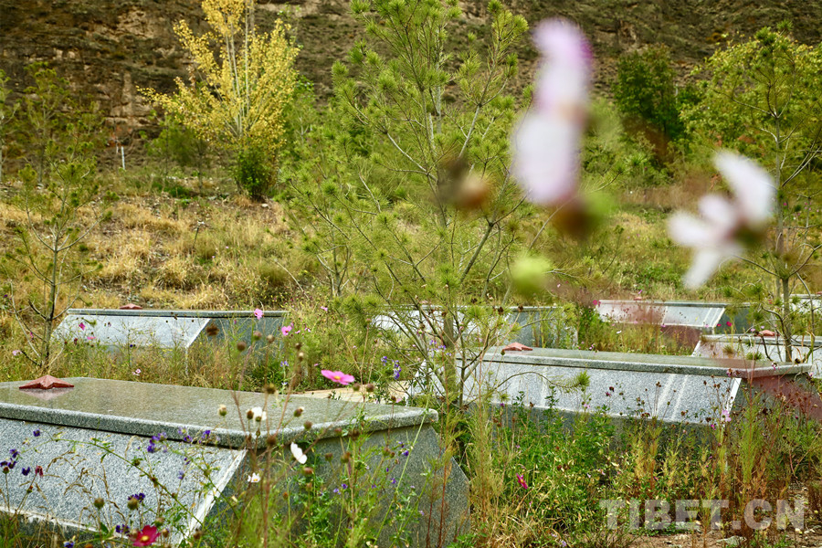 圖為鮮花綠樹(shù)圍繞著的烈士石棺槨 攝影:龍真多吉
