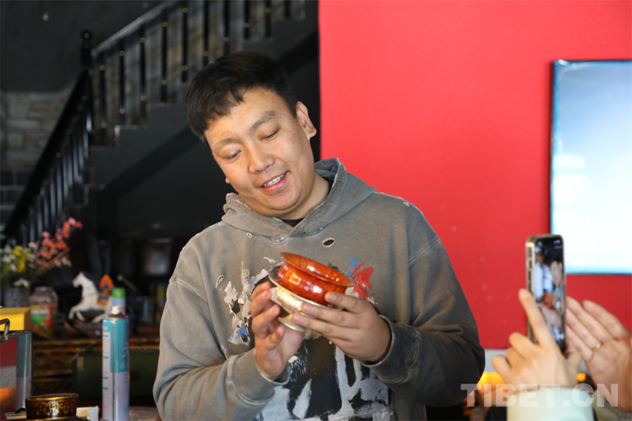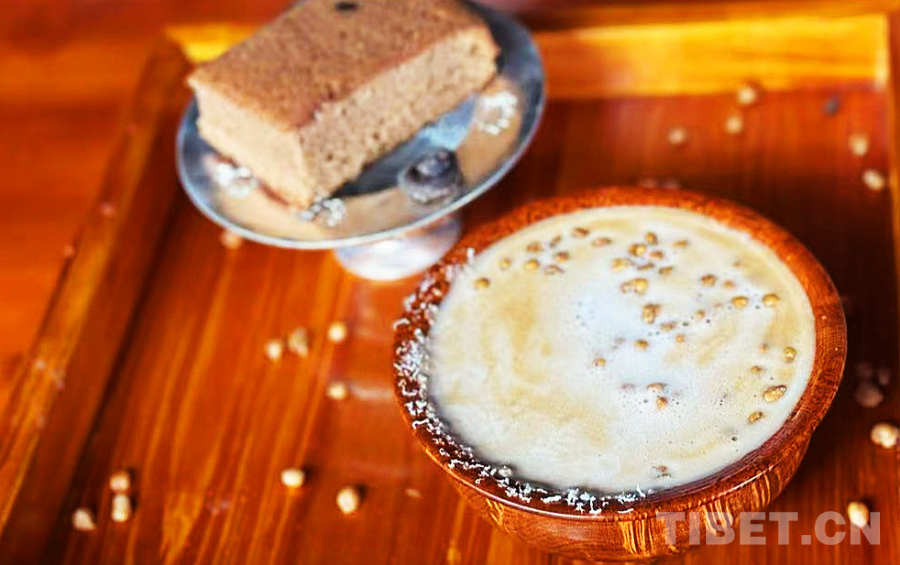 在濃郁的咖啡液里注入青稞奶,撒上當(dāng)?shù)禺a(chǎn)的酸酸的奶渣和青稞粒——一碗香濃的咖啡完成了。是的,是“一碗咖啡”,索朗群培專門選用了藏族群眾喜愛的傳統(tǒng)木碗用作咖啡杯。