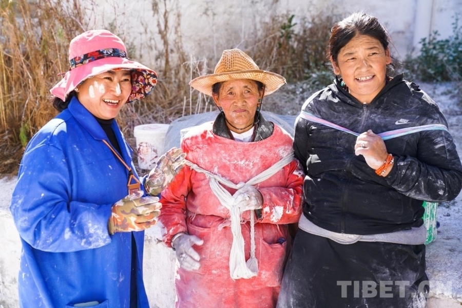 “布達拉宮外墻的白色涂料主體是來源于拉薩市當雄縣羊八井和日喀則市仁布縣一帶的高嶺土,也就是我們通常所說的白灰。為了保證涂料的黏性和光澤度,在白灰兌上水后,我們會加入牛奶、白糖、牛骨膠、植物膠等配料。這些配比都是由長期從事布達拉宮文物保護的工匠來操作的,每種原材料的比例都是經(jīng)過匠人們長期的經(jīng)驗積累所總結出的最佳配比方案。我們經(jīng)常會遇到群眾在幫忙的過程中在配比好的涂料中加入自己隨身攜帶來的牛奶等物,我們能夠理解群眾善良質(zhì)樸的心情,但其實改變了涂料配比后原有的黏度、光澤度都會改變,是不利于文物保護的?!边叞铜傔_說布達拉宮管理處每年都會在粉刷季向群眾和游客科普文物保護知識,希望群眾和游客在參與粉刷之時能夠遵守秩序,共同保護好這一文化遺產(chǎn)。