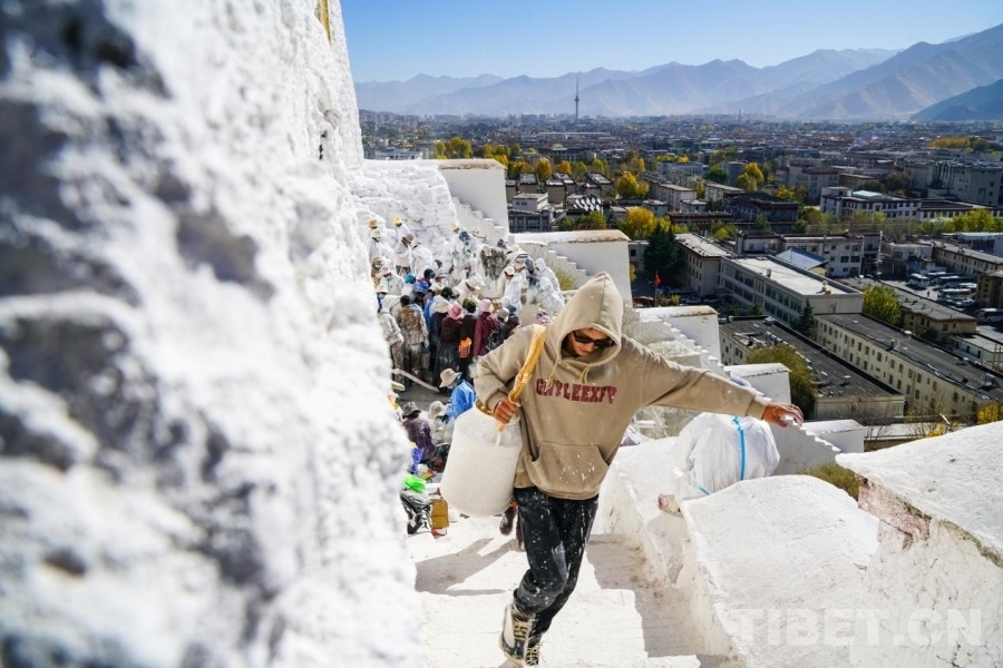 布達拉宮外墻粉刷一般持續(xù)7-10天,要在藏歷的9月22日之前全部完成。此刻,拉薩的雨季剛剛結束,冬季的寒冷結冰尚未到來,每年大家都趕在入冬之前完成這一浩大的粉刷工程。