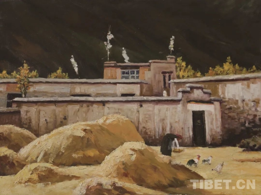 圖為“藍天白云——雪域高原油畫作品巡展”作品《金秋農舍》(60x80cm 布面油畫)作者:丹增朗杰