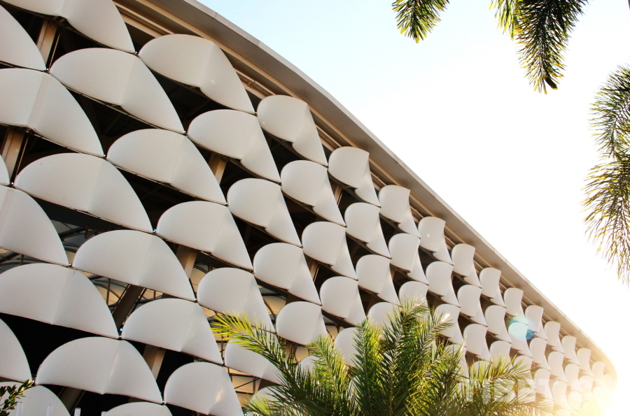 圖為三亞市體育中心體育場外立面層次分明的白鷺膜單元造型 攝影:劉莉