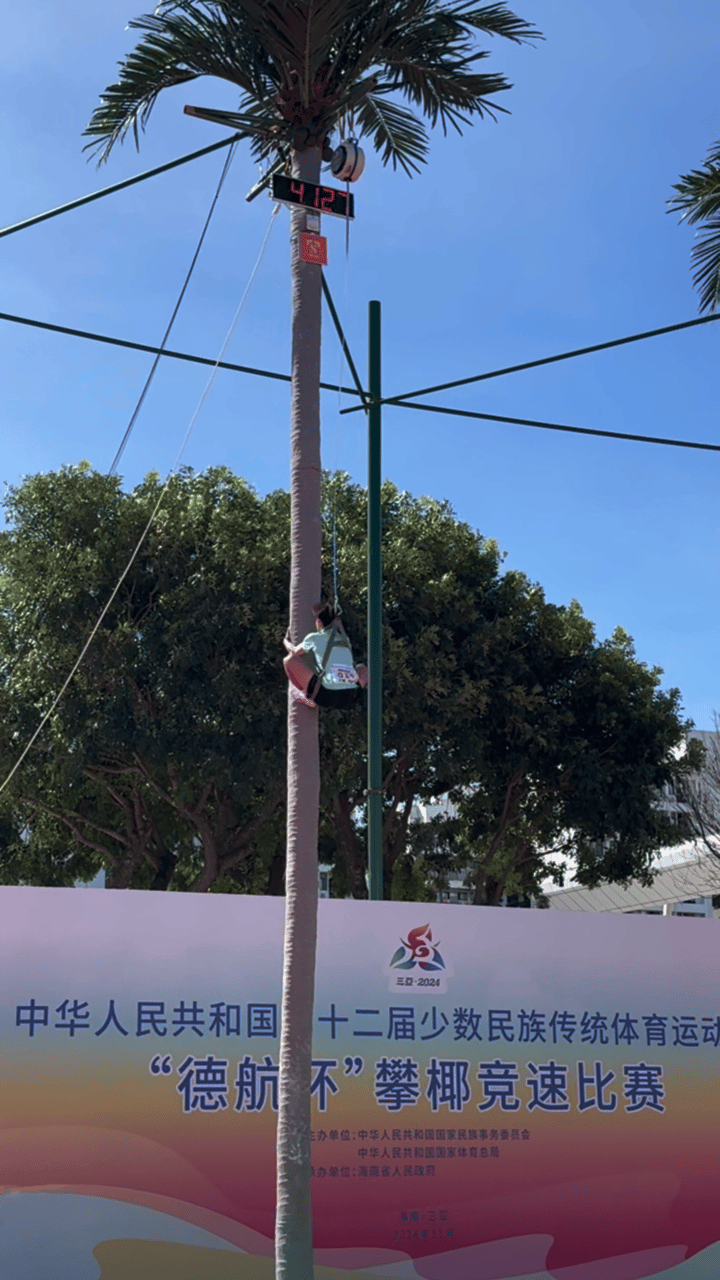 攀椰競(jìng)速設(shè)立男子攀椰9米競(jìng)速和女子攀椰7米競(jìng)速兩個(gè)項(xiàng)目,比賽要求運(yùn)動(dòng)員使用統(tǒng)一提供的攀椰運(yùn)動(dòng)用具,徒手攀爬至椰樹(shù)頂部并按下計(jì)時(shí)器,用時(shí)短者獲勝。