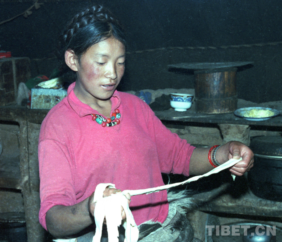 圖為藏北班戈縣牧女正在制作奶制品“啦啦”(唐召明1987年攝)
