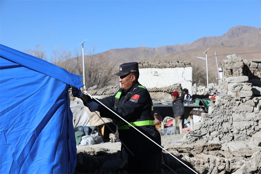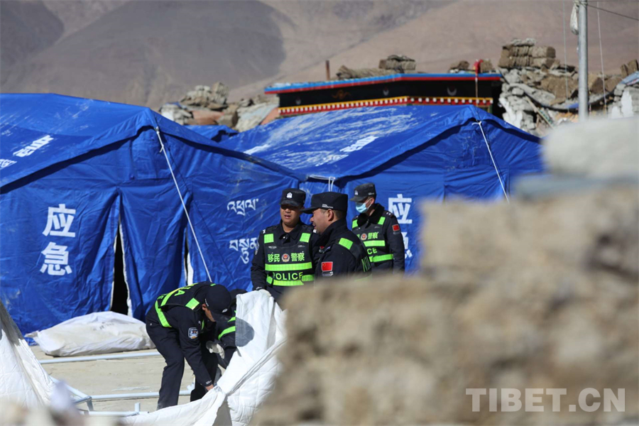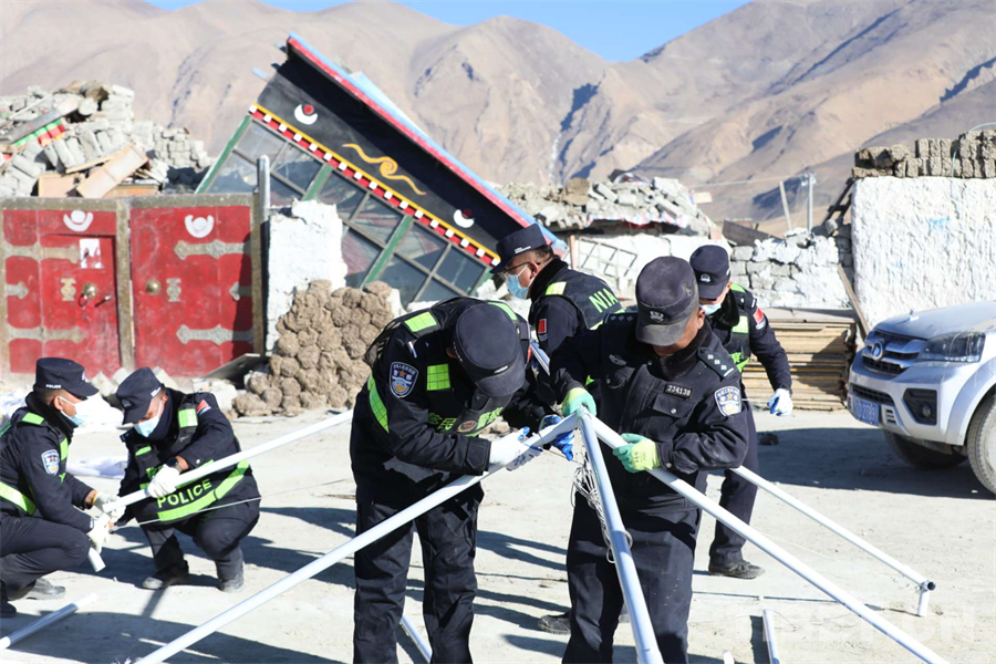 圖為西藏移民管理警察在定日縣長所鄉(xiāng)雜村為受災群眾安裝帳篷 攝影:郭遠敬
