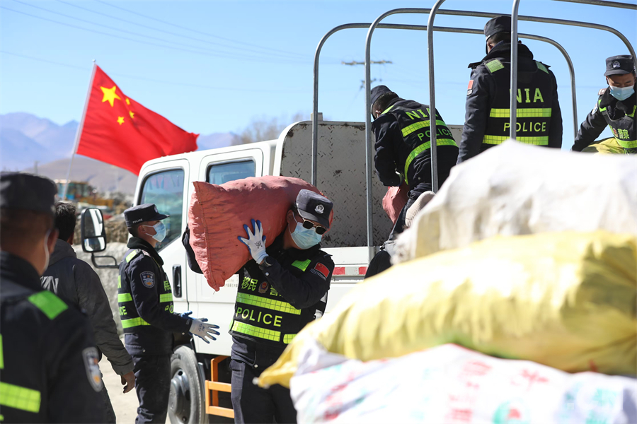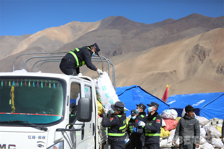 圖為西藏移民管理警察在定日縣長所鄉(xiāng)雜村為受災群眾轉移物資 攝影:郭遠敬