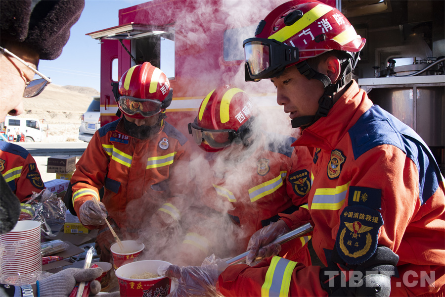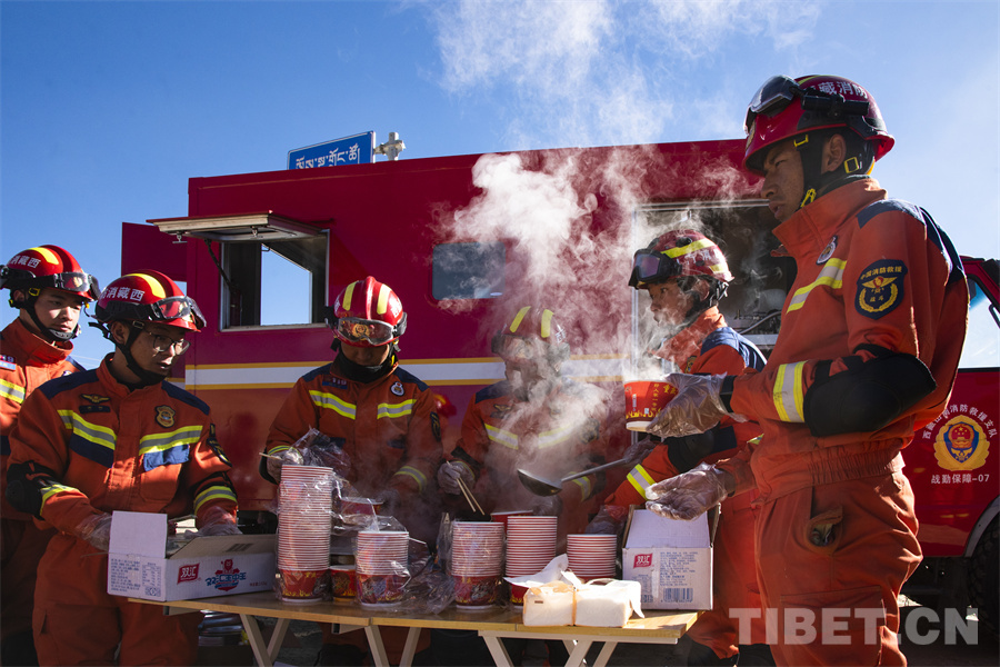 圖為山南市消防救援支隊消防員在受災(zāi)安置點前發(fā)放熱餐 攝影:趙振宇
