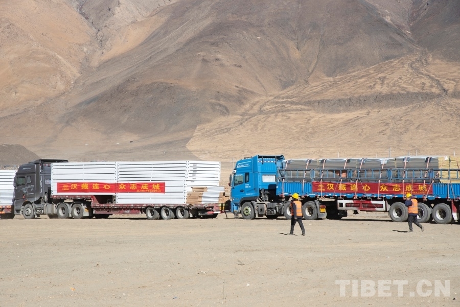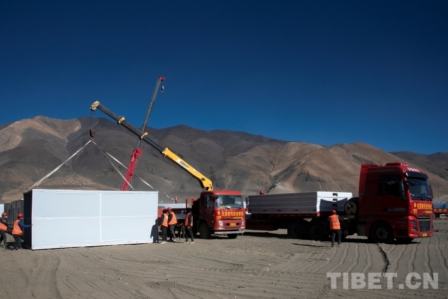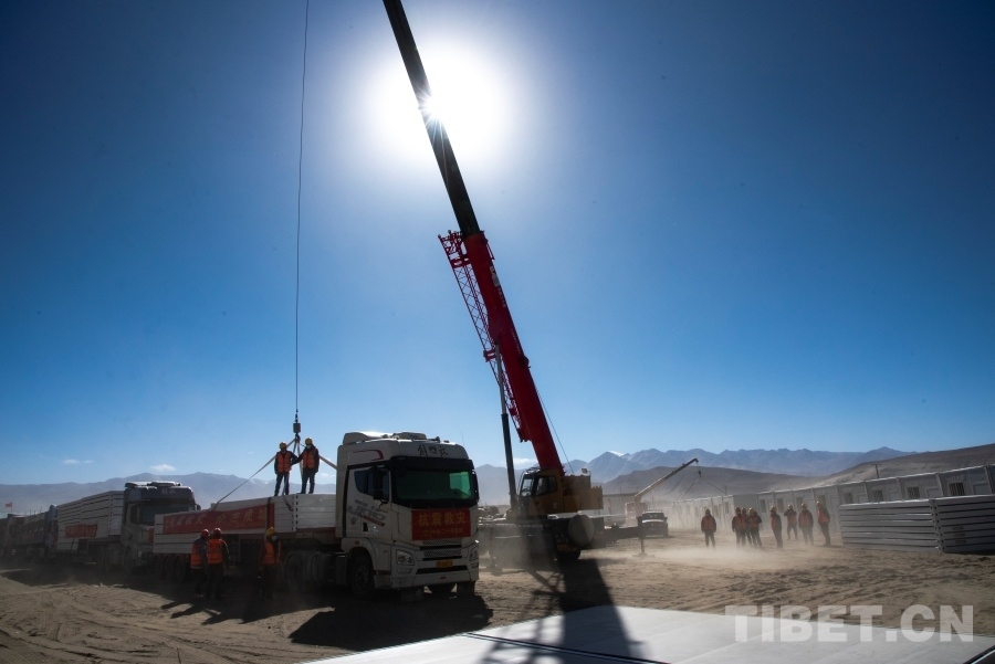 圖為工作人員正在日喀則市定日縣長所鄉(xiāng)森嘎村內(nèi)抓緊搭建活動板房 攝影:趙振宇