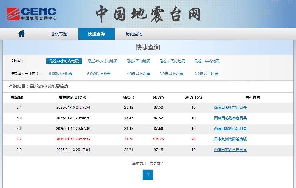中國(guó)西藏網(wǎng)訊 據(jù)中國(guó)地震臺(tái)網(wǎng)發(fā)布的數(shù)據(jù)顯示,1月13日晚20:17:04至21:14:54,西藏自治區(qū)日喀則市定日縣1小時(shí)內(nèi)發(fā)生了4次地震。當(dāng)晚21:14左右,距離定日縣90余公里的定結(jié)縣縣城內(nèi)震感明顯,房屋及屋內(nèi)物品連續(xù)兩次晃動(dòng),人行略感不穩(wěn),每次持續(xù)時(shí)間約5秒左右,間隔約2分鐘。