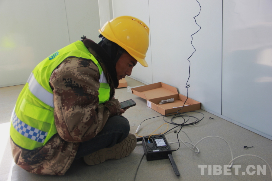 圖為中國電信日喀則分公司智慧家庭工程師多次正在長所鄉(xiāng)森嘎村新建板房里調(diào)試光貓信號 攝影:劉莉