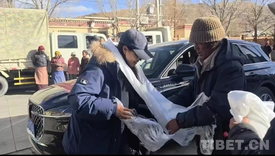 圖為西藏消防駐成都消防聯(lián)絡保障中心工作人員趙涵運送物資到日喀則市拉孜縣受到村民歡迎