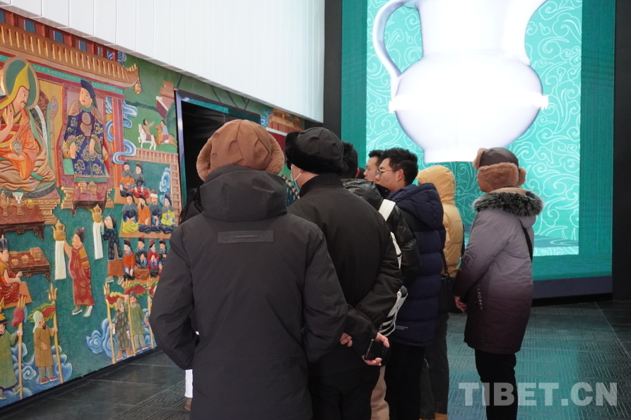 “合同一家”部分展示了布達(dá)拉宮館藏織物、唐卡、造像等精美文物。一件件來(lái)自江南的織物,一幅幅風(fēng)格融合的唐卡,巧妙地展現(xiàn)出一種獨(dú)特的和諧之美。這種融合不僅是一場(chǎng)視覺(jué)上的盛宴,更深層次地引發(fā)了參觀游客對(duì)于民族文化交流的共鳴。它們仿佛是茶馬古道上的使者,承載著西藏與祖國(guó)各地各民族往來(lái)交流的歷史,讓參觀游客在贊嘆其工藝精湛的同時(shí),也能深刻感受中華民族文化的厚重與魅力。