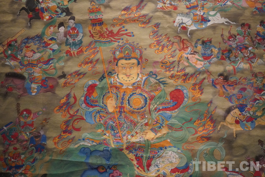 圖為清財(cái)神像唐卡局部。這幅主尊黃財(cái)神及八大馬王唐卡,主尊周圍生動(dòng)地繪滿了傳統(tǒng)道教水陸畫(huà)中常見(jiàn)的人物形象,反映了古代青藏高原與河西走廊地區(qū)的文化交流,體現(xiàn)出我國(guó)多民族文化在邊疆地區(qū)的廣泛互動(dòng) 攝影:張宇