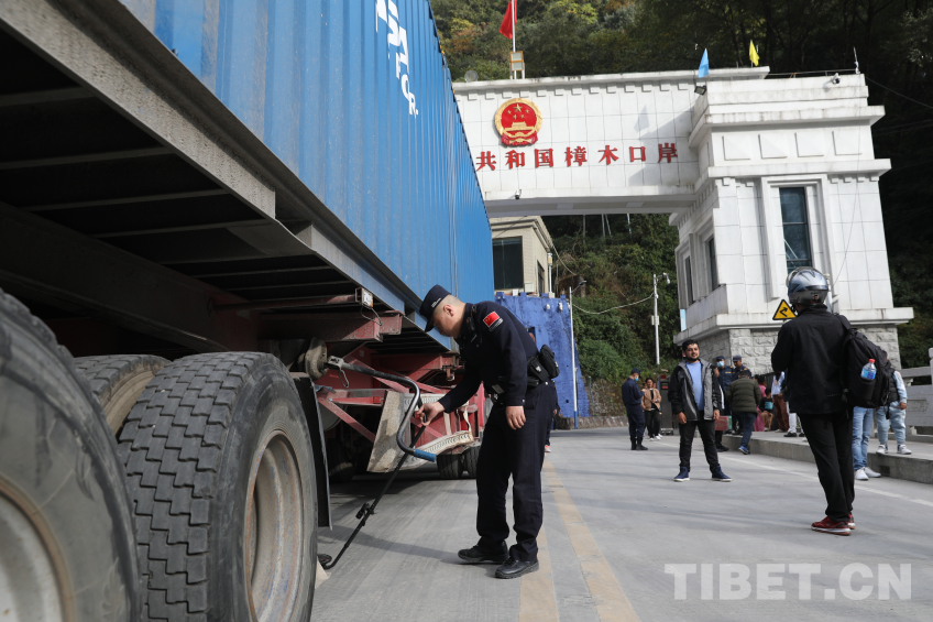 圖為尼泊爾貨車經(jīng)過里孜國門 攝影:蔣美靈