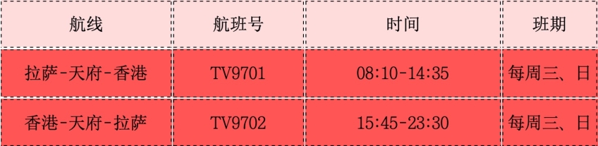 該航線由西藏航空執(zhí)行,計劃每周三、周日執(zhí)飛,航班號TV9701,于8:10拉薩起飛,在天府經(jīng)停后,14:35到達(dá)香港;返程航班號TV9702,于15:45香港起飛,在天府經(jīng)停后,23:30到達(dá)拉薩。