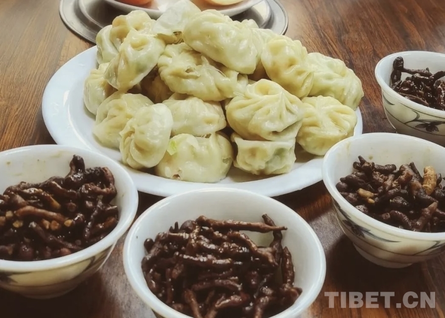 到了中午,我們會(huì)邀請(qǐng)鄰里親戚來(lái)家里做客,除了準(zhǔn)備米飯蔬菜,在牧區(qū),主人家還會(huì)煮牛羊的頭來(lái)招待客人。大人們都愛(ài)吃肉,年輕人都喜歡吃各類蔬菜。到了下午,我們就會(huì)吃人參果拌酥油,還有肉包子。