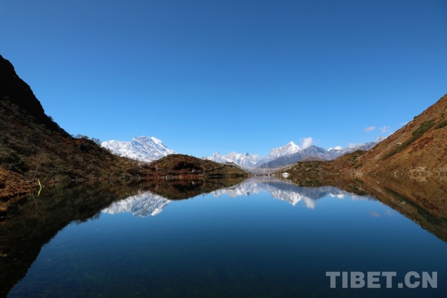 湖水清澈見(jiàn)底,倒映著雪山與天空,