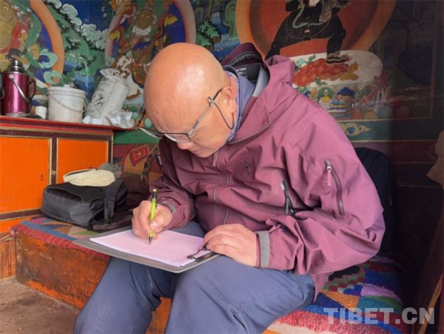 圖為羅文華在薩迦寺內(nèi)認真測繪 攝影:王妍丹