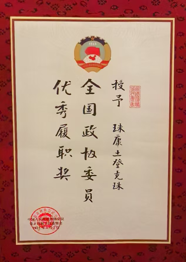 圖為珠康·土登克珠榮獲的2024年度“全國政協(xié)委員優(yōu)秀履職獎”