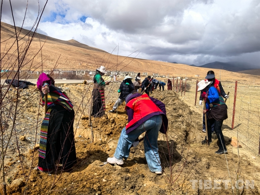 伴隨著一次次鐵鍬鑿擊地表的“嚓嚓”聲、此起彼伏的藏語勞動歌曲和樹苗抖動的“沙沙”聲,一排排規(guī)整的樹坑網格慢慢被鑿出,一棵棵象征希望的樹苗緩緩落下,一抔抔承載著綠色生命的黃土再次埋下,村主干道邊綿延80余米的“綠色生命線”初見雛形,120余棵樹苗挺立村道兩側,以“綠絲帶”串聯村莊,為春日家園增添盎然生機。